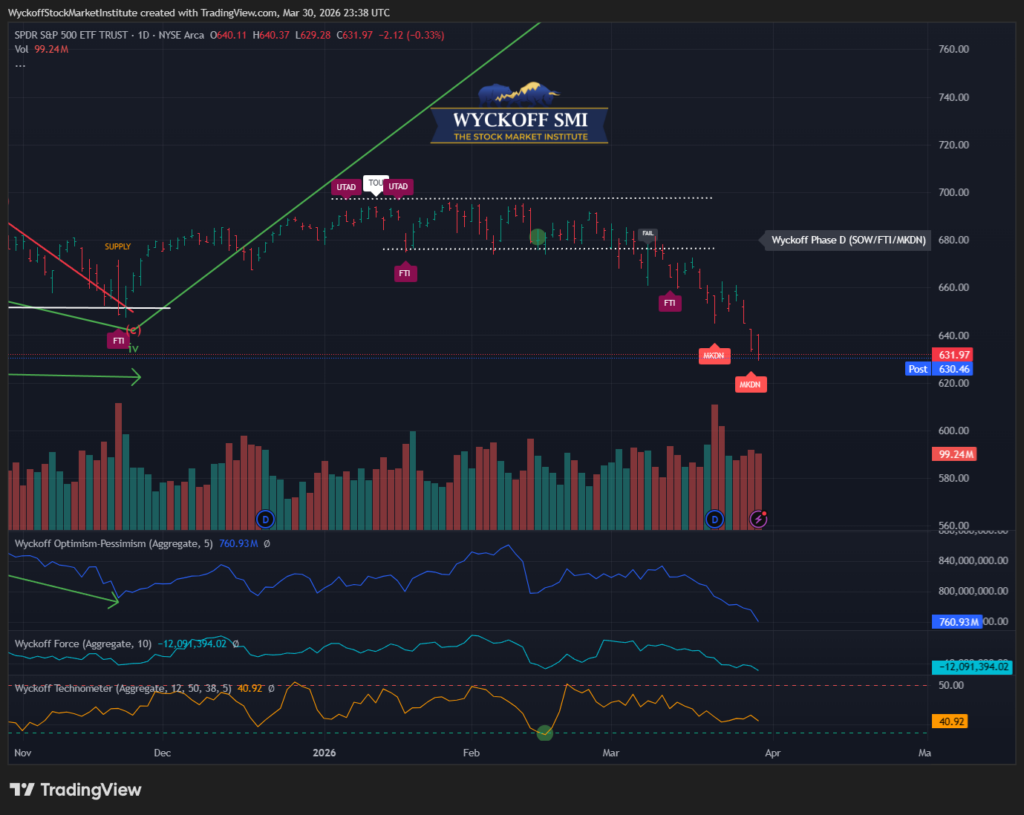 SPY remains in a confirmed markdown phase with continued SOW → FTI → MKDN behavior.