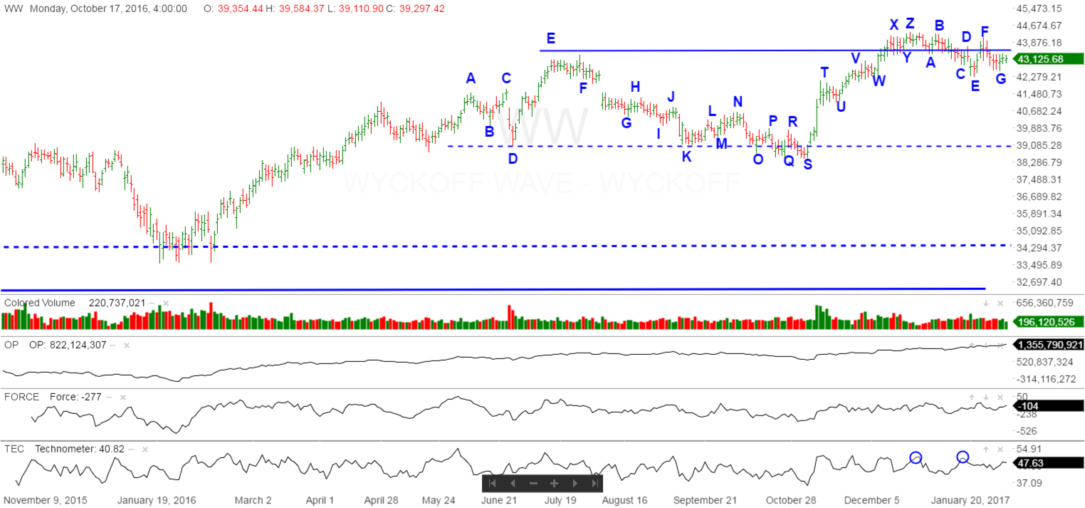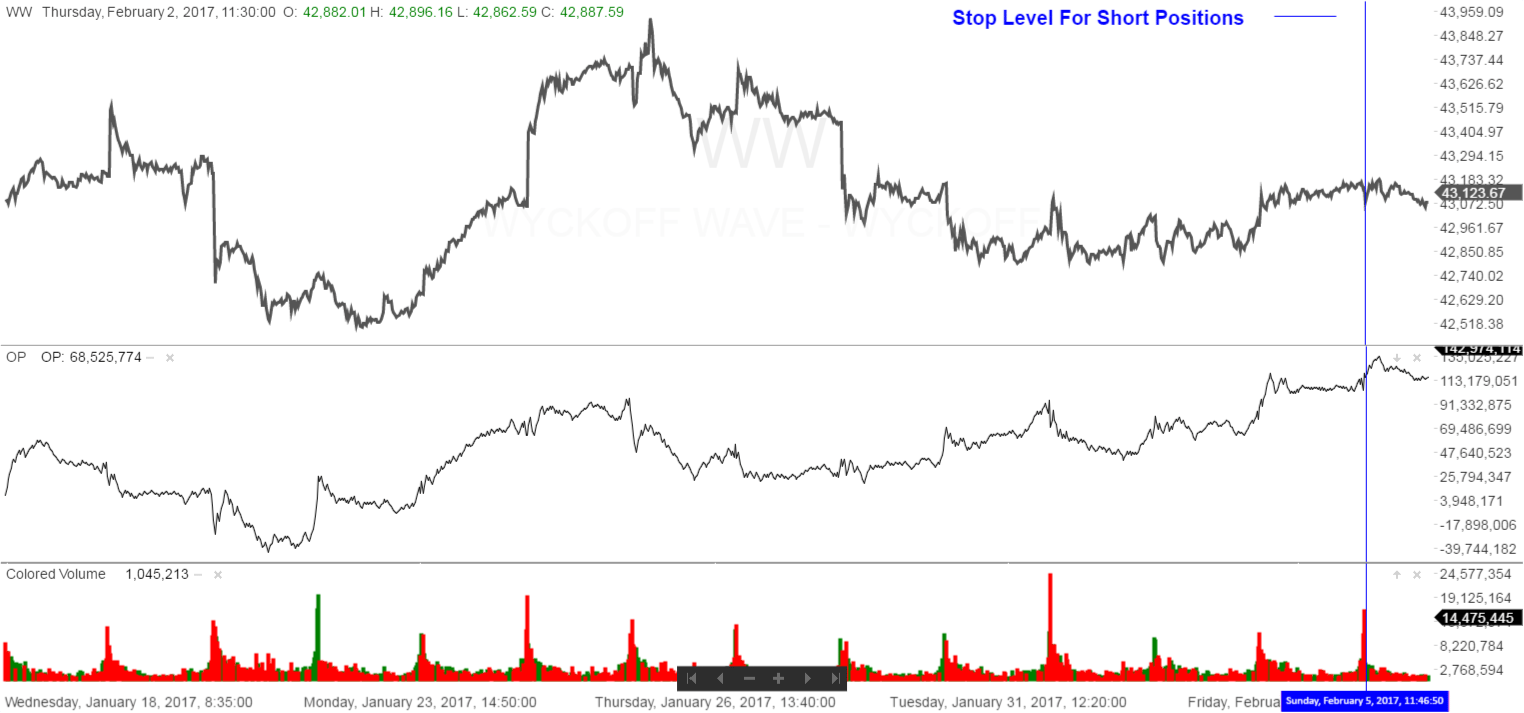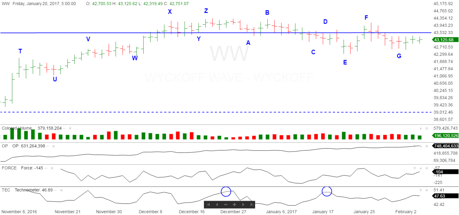 The stock market, as measured by the Wyckoff Wave opened unchanged today, and then traded the rest of day in a narrow range and closing slightly lower. Volume was lower than it has been in the last month. The price spread and volume gave no major clues once again today.