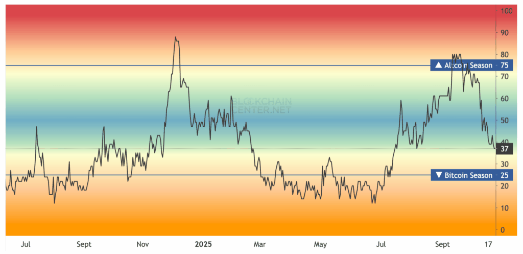 Market indicators corroborate this downturn. The Altcoin Season Index, which measures whether 75% of the top 50 non-stablecoins outperform Bitcoin over 90 days, has plummeted to 37. This marked its lowest point since mid-July, firmly entrenching a “Bitcoin Season.”