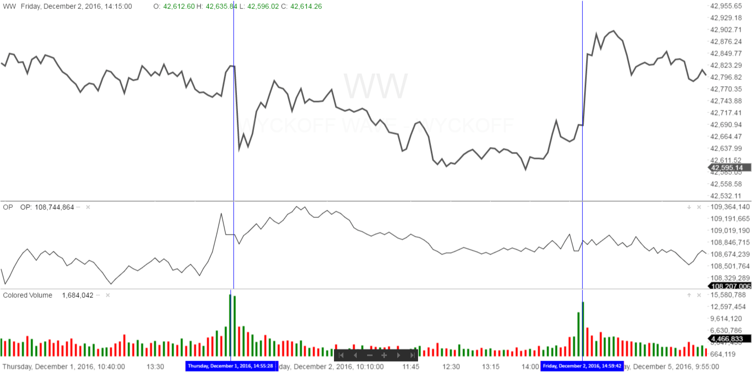 The Intra-day Optimism-Pessimism Index was in a negative divergence with the Wyckoff Wave as the Wave made a new high this morning. This is a negative divergence with price hitting a new high, with volume not supporting it.