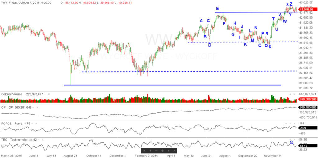 The stock market, as measured by the Wyckoff Wave opened slightly higher then had a quick correction to the lows of the day, before experiencing a half way rally back to end the day. Volume has been relatively low last three days.