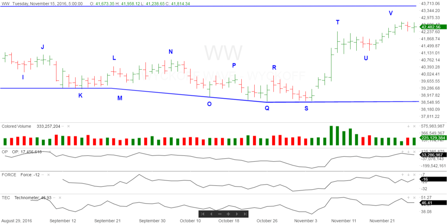 This suggests the Wyckoff Wave will react back towards the bottom of the trading range.