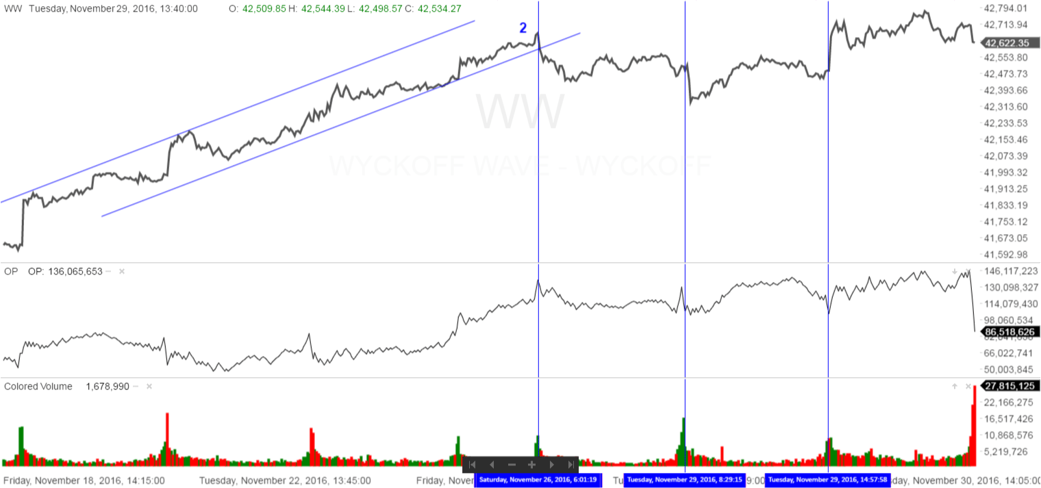 The stock market, as measured by the Wyckoff Wave, opened higher off of the OPEC agreement news, then traded the better part of the day trying to extend those gains. But late in the day strong volume came into the downside and the majority of the days gains were erased. The Wyckoff Wave closed up slightly, in a neutral condition relative to the Technometer. The price spread and volume suggest supply coming into the market.