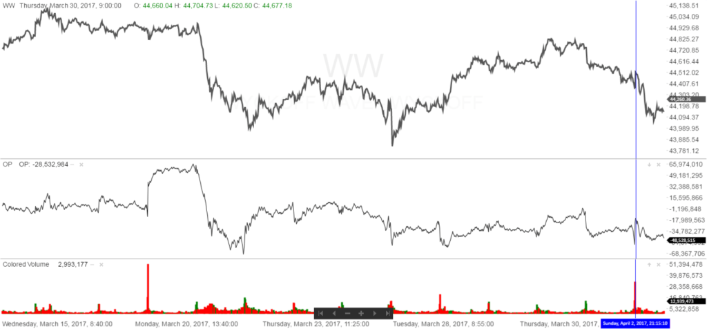 The stock market, as measured by the Wyckoff Wave opened lower, and worked lower into early afternoon, and then recovered some of the losses by the close. Volume was the same as Friday with some supply present.