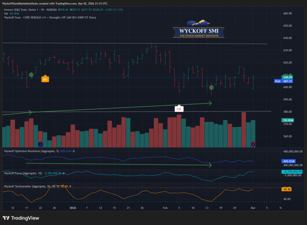 The major indexes spent the session consolidating within their recent trading ranges, with both SPY and QQQ continuing to move sideways beneath overhead resistance. From a Wyckoff perspective, the market remains in a late-stage trading range environment, where demand continues to appear on dips but supply is still present near the highs. Until the indexes can decisively break above resistance, this type of action typically favors select leadership stocks rather than broad market momentum.