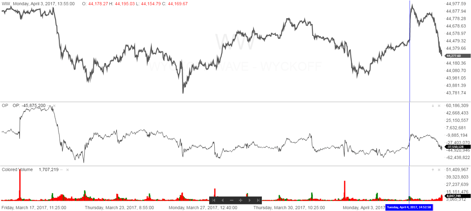 The O-P closed lower today and in harmony with the selloff. The Wave rallied to three new highs since March 22nd (on the above chart), and you can see that on each one of these successive highs, the O-P failed to confirm. It appears there is no major interest in the upside, and we can continue to correct from here.