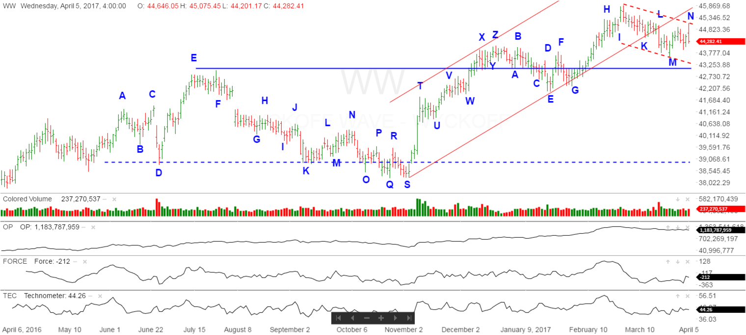 The stock market, as measured by the Wyckoff Wave opened sharply higher, and stayed firm into the noon hour. After which waves of selling came in and drove the wave to a lower close. Today is a key reversal on the charts and establishes a downtrend that we show in the red dash lines on the daily chart. Volume was slightly higher today, but nothing dramatic. After the early rally, supply came in to the downside.