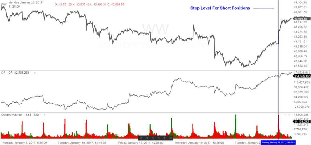 The stock market, as measured by the Wyckoff Wave opened sharply higher today, and once again continued higher for the rest of the day. Volume was unchanged today from yesterday, and still at average levels. The price spread and volumes showed demand present once again. Today’s rally changes the intra-day trend to up, as well as the short term trend to neutral.