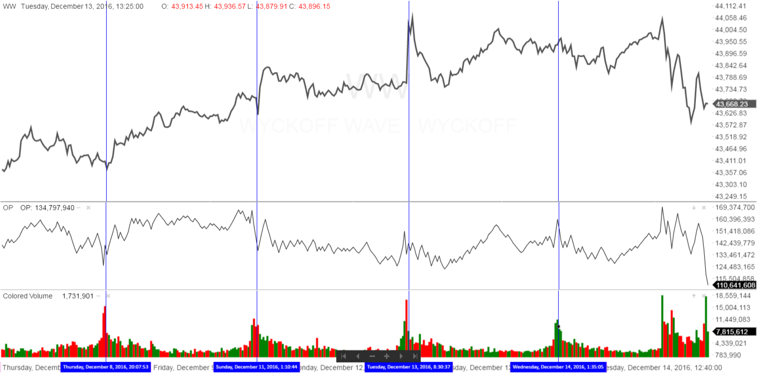 The stock market, as measured by the Wyckoff Wave, traded both sides of unchanged until the Fed announcement. The Fed announcement gave us a quick spike which was the high of the day. Then volume came in to the downside, and the Wyckoff Wave closed near the lows of the day, on an increase in volume.