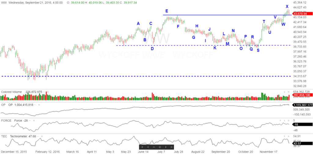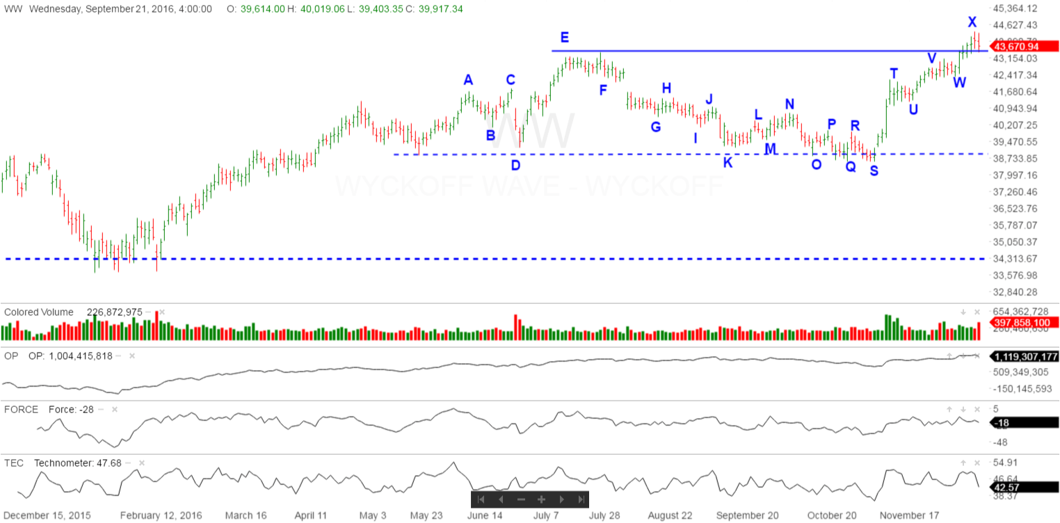 Todays action suggest that it will still be difficult for the Wyckoff Wave to move significantly past the resistance at the top of the trading range.