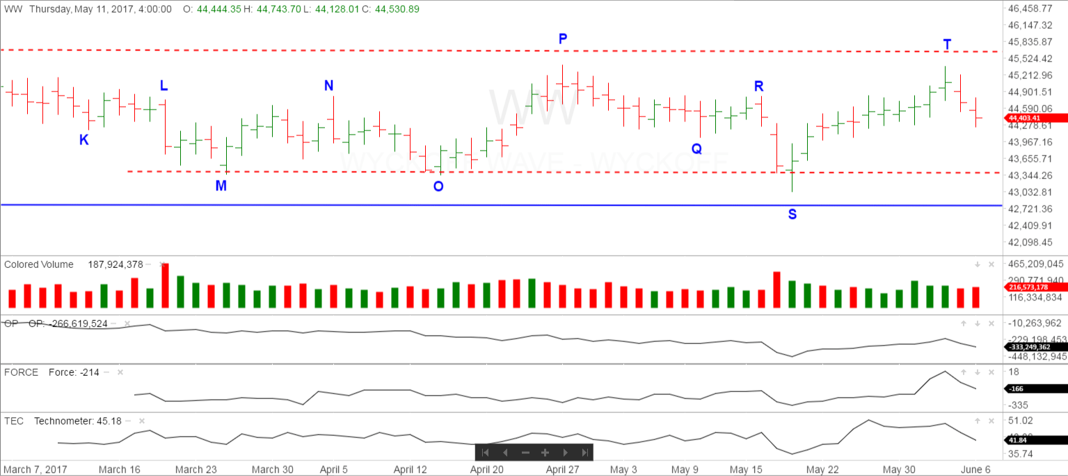 The stock market, as measured by the Wyckoff Wave opened lower then continued to work lower throughout the session and closing on the low of the day. Volume was unchanged from recent days, and showed some supply present once again.