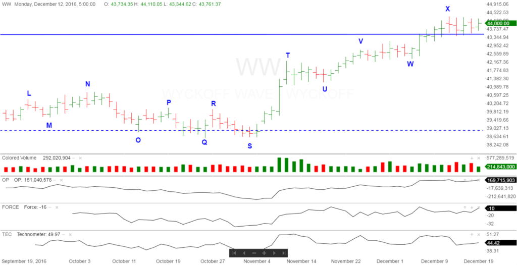 Today, the Wyckoff Wave traded slightly higher on a decrease in volume. The reaction we have been expecting over the last few weeks still is having trouble getting started. We would expect to see this reaction continue to lower levels. The recent rally to “X” has not had a dramatic increase in spread or volume, and does not appear we had a Jump Across The Creek, but more so a test of the upper end of the trading range. Todays rally did nothing to change these observations.