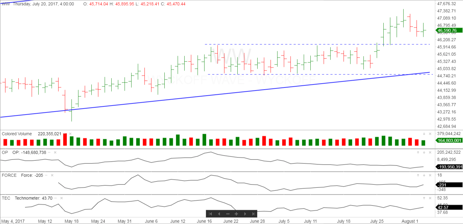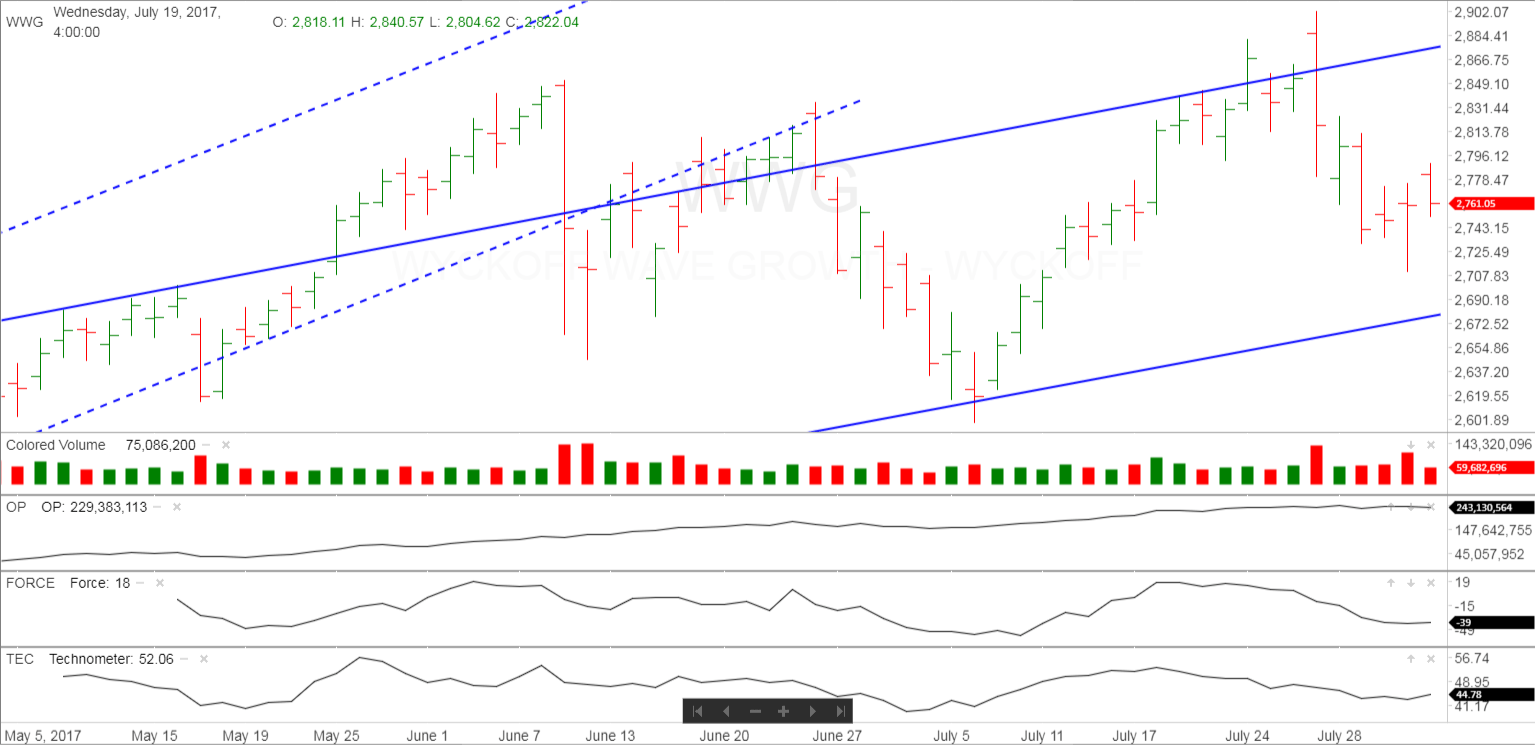 The stock market, as measured by the Wyckoff Wave opened slightly higher, and spent the rest of the day trading in a narrow range. Volume was lower today once again.