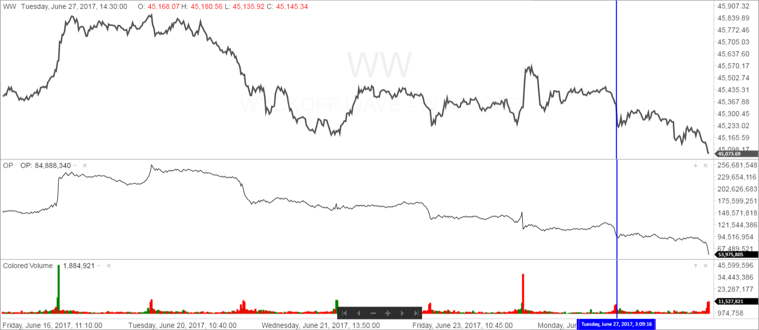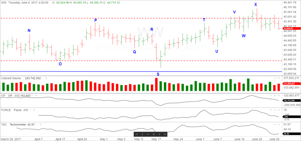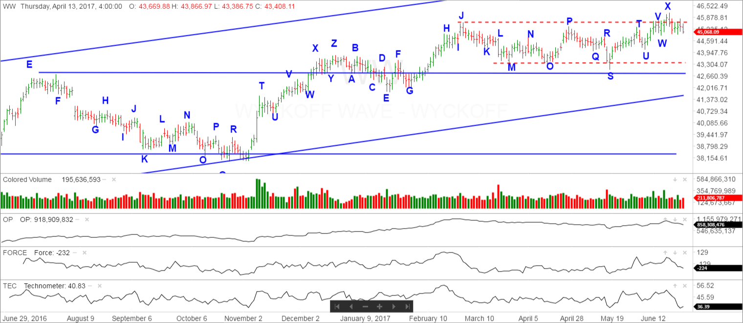 The stock market, as measured by the Wyckoff Wave opened slightly lower, and spent the rest of the day stair stepping lower to close at the low of the day. Volume was slightly higher today, but would like to see this increase if we have experienced an upthrust and test.