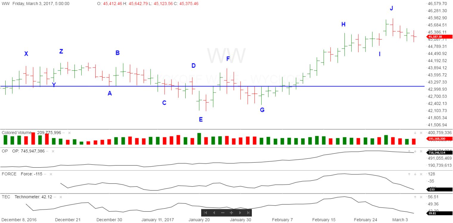 The stock market, as measured by the Wyckoff Wave opened lower today, then traded in a narrow range for the majority of the day, and then closed down slightly on the day. Price and volume show some supply still present.