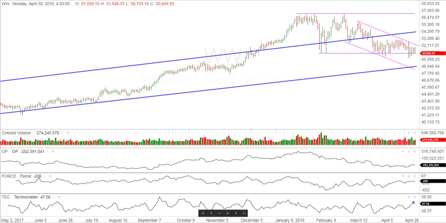 The stock market, as measured by the Wyckoff Wave traded lower Monday. We had warned on our “Week In Review” report that we could see some weakness this week to relieve the overbought Technometer. Also we would test the support at 51,000 to see if it is strong enough to hold. We feel that this support level will give away…